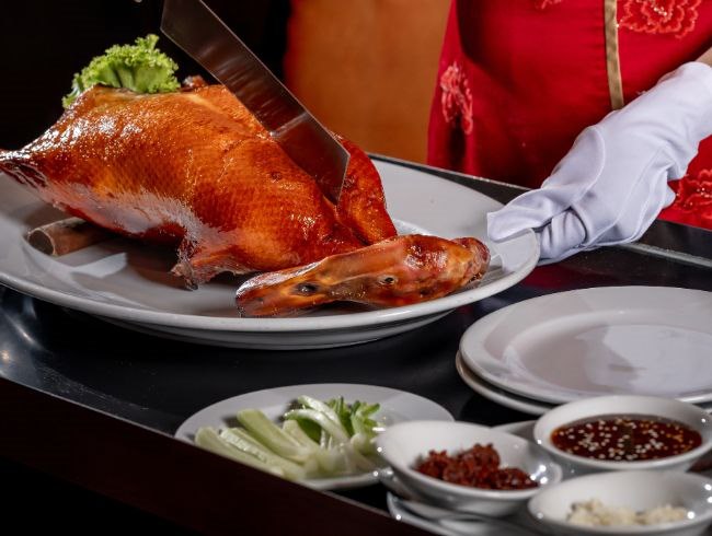 Fei Ya Peking Duck, roasted over lychee wood to impart a unique sweet and fragrant aroma. Served with side dishes and dried lychee, which adds a delightful sweet and tangy dimension to create a perfectly balanced flavor.